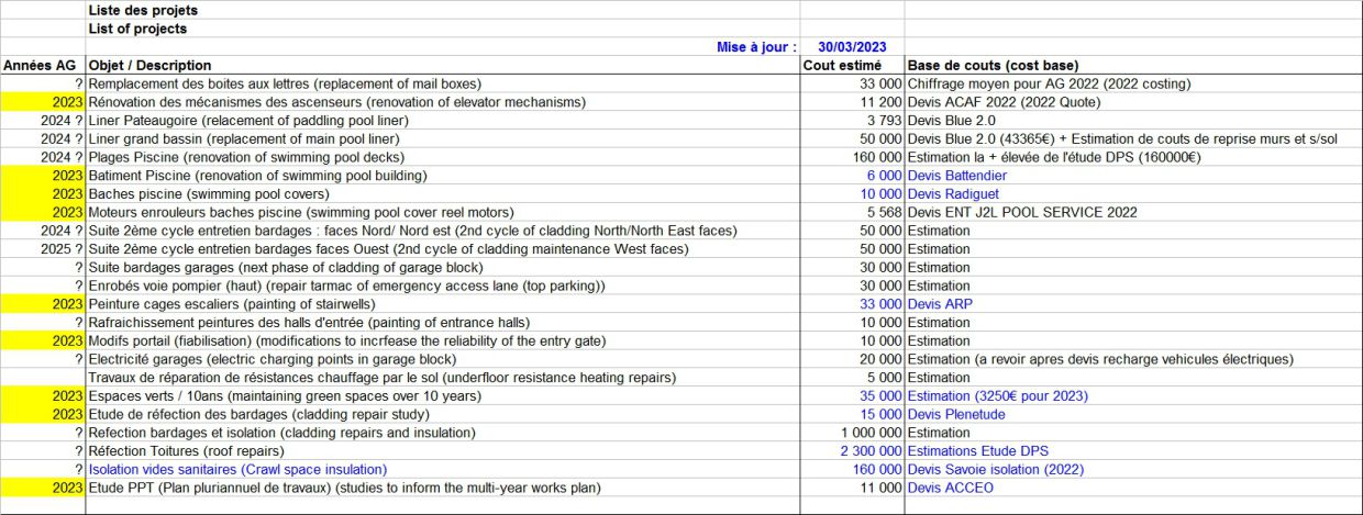 - Les couts des projets énumérés ci-dessous ont été estimés sur la base de devis plus ou moins récents, de couts connus de travaux équivalents ou d'estimations d'entre-nous et peuvent par conséquent varier avec les devis finaux qui vous seraient proposés en Assemblée Générale.